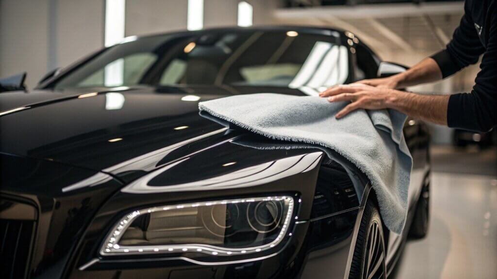 A high-end car cover being placed on a luxury car, highlighting the soft interior