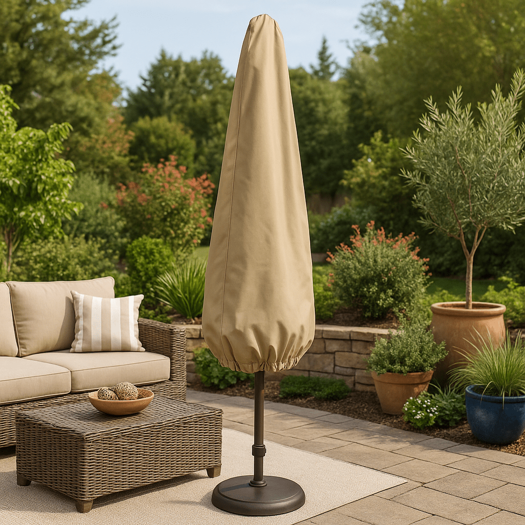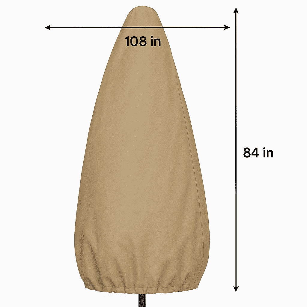 This patio umbrella protection cover is the ideal companion for outdoor living. The reinforced 600D nylon fabric features 4500mm waterproof rating and 50+ UV protection, effectively preventing water penetration and sun fading. The drawstring tightening design makes installation easy and convenient, while excellent breathability prevents internal moisture and mold. The standard 108-inch diameter × 84-inch height dimensions fit most patio umbrellas, and three natural colors blend perfectly with outdoor environments, keeping your garden equipment lasting like new.